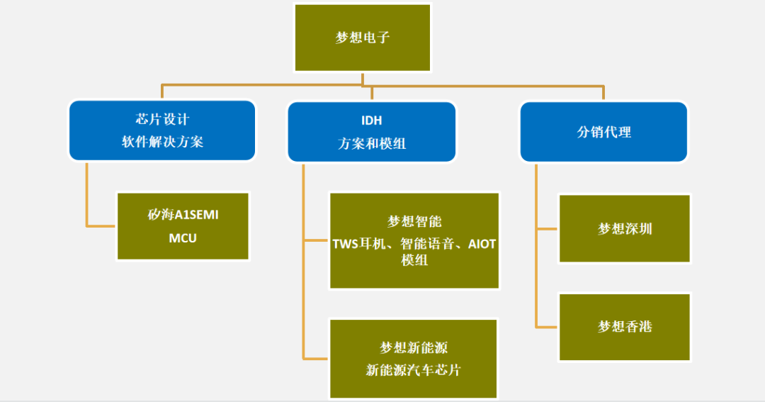 4个业务板块:矽海半导体(A1semi)为芯片设计、应用方案及模组提供商;梦想智能为TWS耳机、智能语音、IOT模组成套解决方案提供商;梦想新能源为新能源汽车和储能的方案芯片提供商;8383米博体育平台为元器件授权供应商。